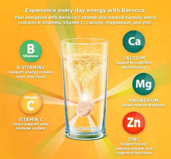 *Berocca Energy has been clinically tested in 7 studies proven to support energy levels. Sarris et al. 2021, Nutr Hosp. 9;38(6):1277-1286. ^When taken daily for 28 days
