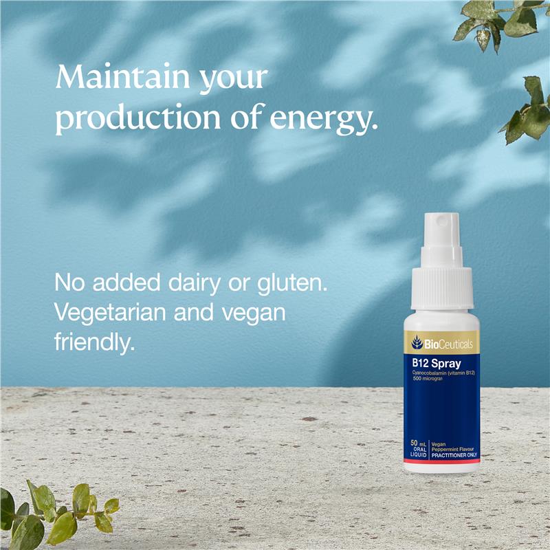 If your diet is low in B12, support the pep in your step with BioCeuticals B12 Oral Spray. Each spray provides a high dose of vitamin B12 to restore your energy levels to get through the day.