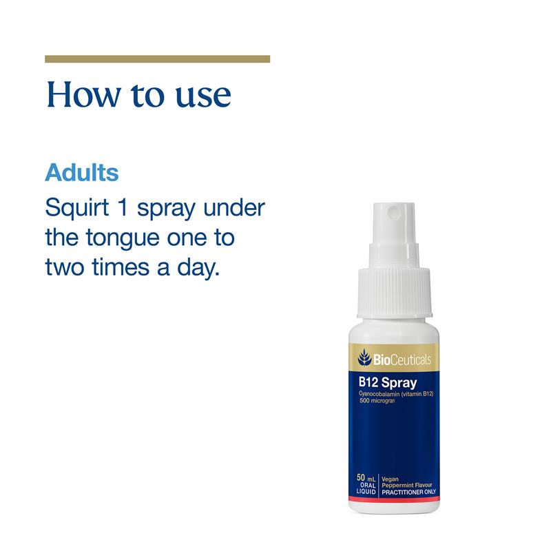 If your diet is low in B12, support the pep in your step with BioCeuticals B12 Oral Spray. Each spray provides a high dose of vitamin B12 to support your energy levels. This supplement also supports your body’s production of healthy red blood cells and supports your immune system functon and nervous system health.BioCeuticals B12 Oral Spray also offers a method of absorption in a vegetarian and vegan-friendly formula.