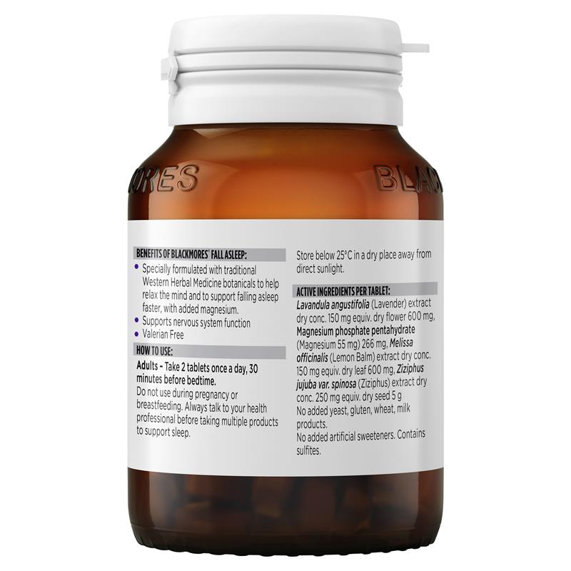 Blackmores Fall Asleep is specially formulated with minerals and botanicals lavender, lemon balm, ziziphus and magnesium to help relax the mind, and help you fall asleep. Adults take 2 tablets once a day 30 minutes before bed time.
