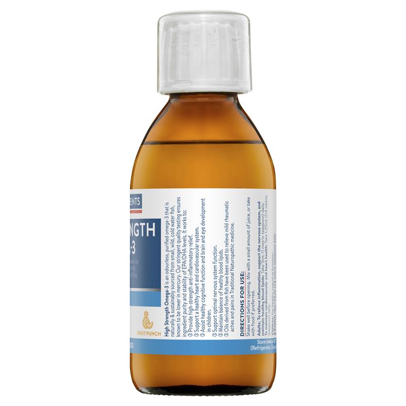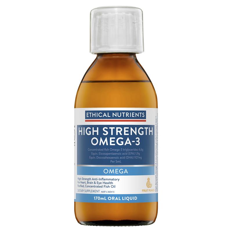 Ethical Nutrients High Strength Omega-3 is quality liquid fish oil for anti-inflammatory relief and support a healthy heart, eyes & brain function. Odourless & available in fruit punch.