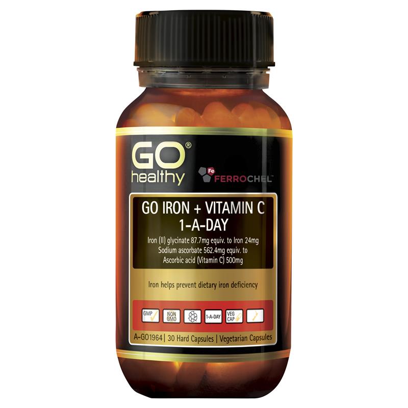 GO Iron + Vitamin C 1-A-Day contains the mineral iron to help prevent dietary iron deficiency when dietary intake is inadequate. Iron is used to help oxygen transport to body tissues, assist in healthy red blood cell production and support energy levels. Vitamin C is included to support absorption of dietary iron.- Iron helps prevent dietary iron deficiency