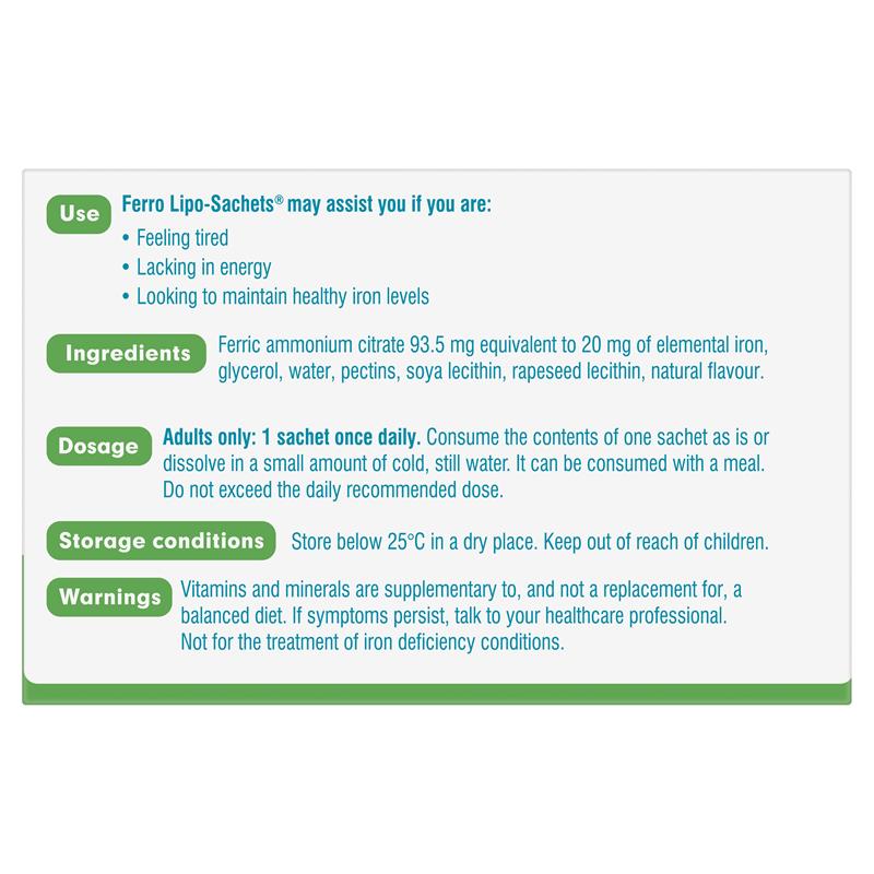 Ferro Lipo-Sachets® contains liposomal iron enclosed in the patented LIPOSHELL® formula. The LIPOSHELL® technology helps ensure the iron is protected from substances within the body's digestive system which may degrade the active ingredient and reduce absorption. Enclosing iron in the LIPOSHELL® liposomes allows effective transport of iron to locations in the body where it is required, resulting in a high absorption rate, and helps to reduce stomach upset, constipation, an unpleasant metallic taste and other side effects that may be experienced with iron supplements.