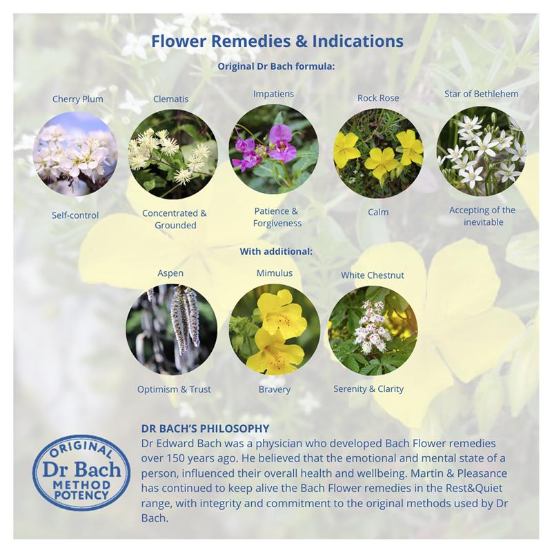 Rest&Quiet Calm Pastilles contains 4 drops of the 8 remedy Calm formula in each pastille. Made with Dr Bach’s original formulation (Cherry Plum, Clematis, Impatiens, Rock Rose & Star of Bethlehem) with an additional 3 remedies (Aspen, Mimulus & White Chestnut) to give the emotional support to overcome our daily stressors that we now face in our ever-changing world.