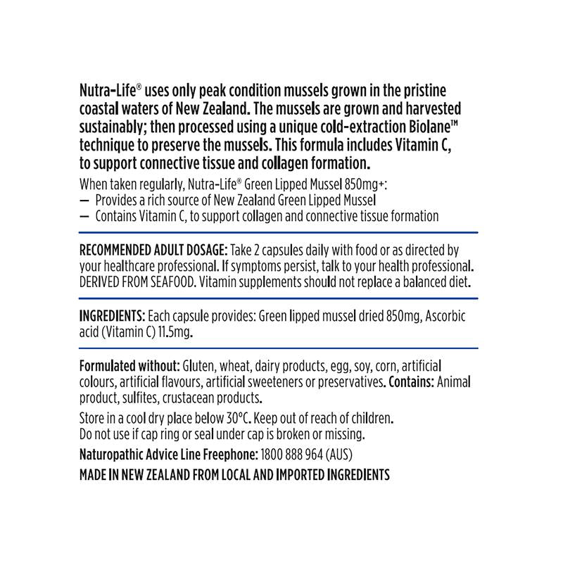 Each capsule provides: Green lipped mussel dried 850mg, Ascorbic