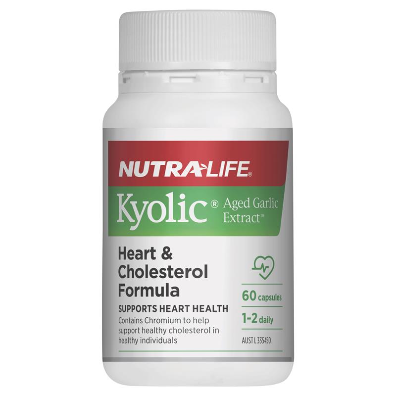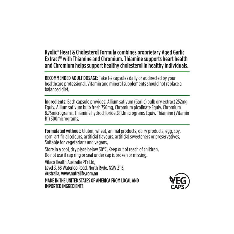 Kyolic® Heart & Cholesterol Formula combines proprietary Aged Garlic Extract™ with Thiamine and Chromium. Kyolic® Aged Garlic Extract™ is the result of a proprietary ageing process of up to 20 months, that transforms the natural sulfur compounds in organically-grown garlic into a range of beneficial, water-soluble, odourless compounds. Thiamine (vitamin B1) supports heart health and Chromium helps support healthy cholesterol in healthy individuals.