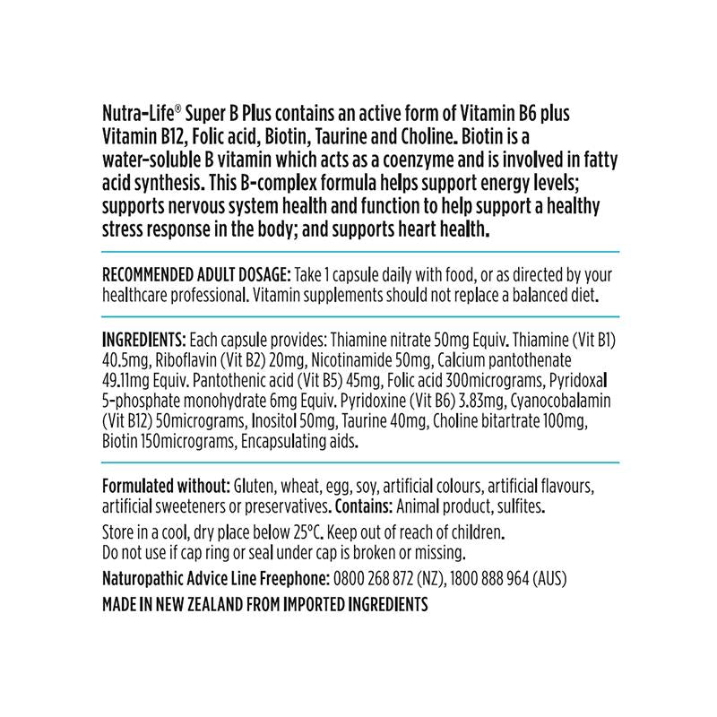 Nutra-Life® Super B Plus contains an active form of Vitamin B6 plus, Vitamin B12, Folic acid, Biotin, Taurine and Choline. Biotin is a water-soluble B vitamin which acts as a coenzyme and is involved in fatty acid synthesis. This B-complex formula helps support energy levels; supports nervous system health and function to help support a healthy stress response in the body; and supports heart health.