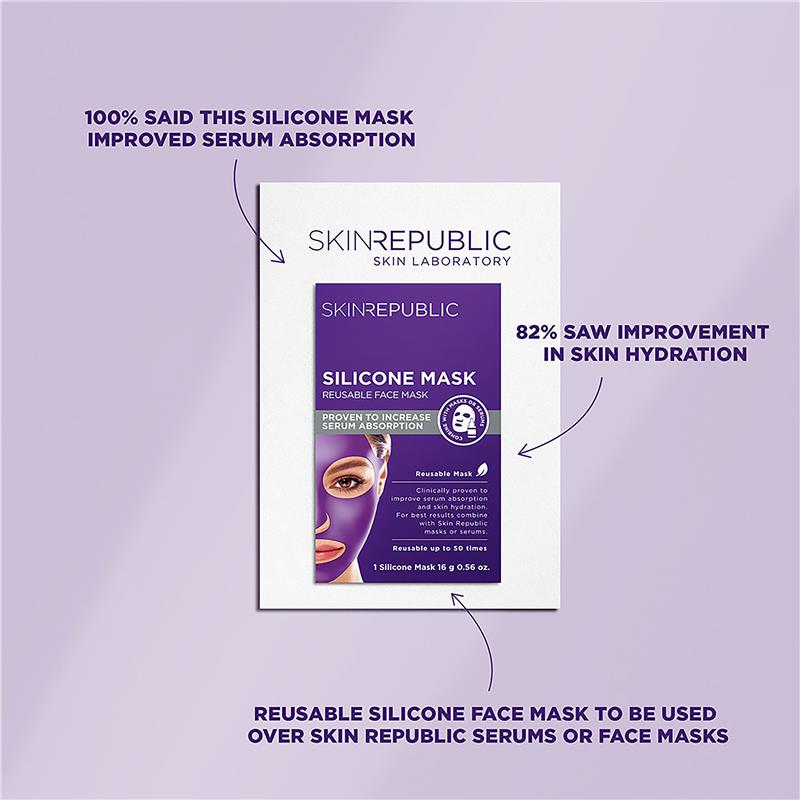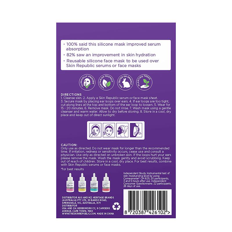 • Reusable silicone face mask to be used over Skin Republic serums or face masks.• Prevents evaporation and traps heat helping serums penetrate deeper into the skin