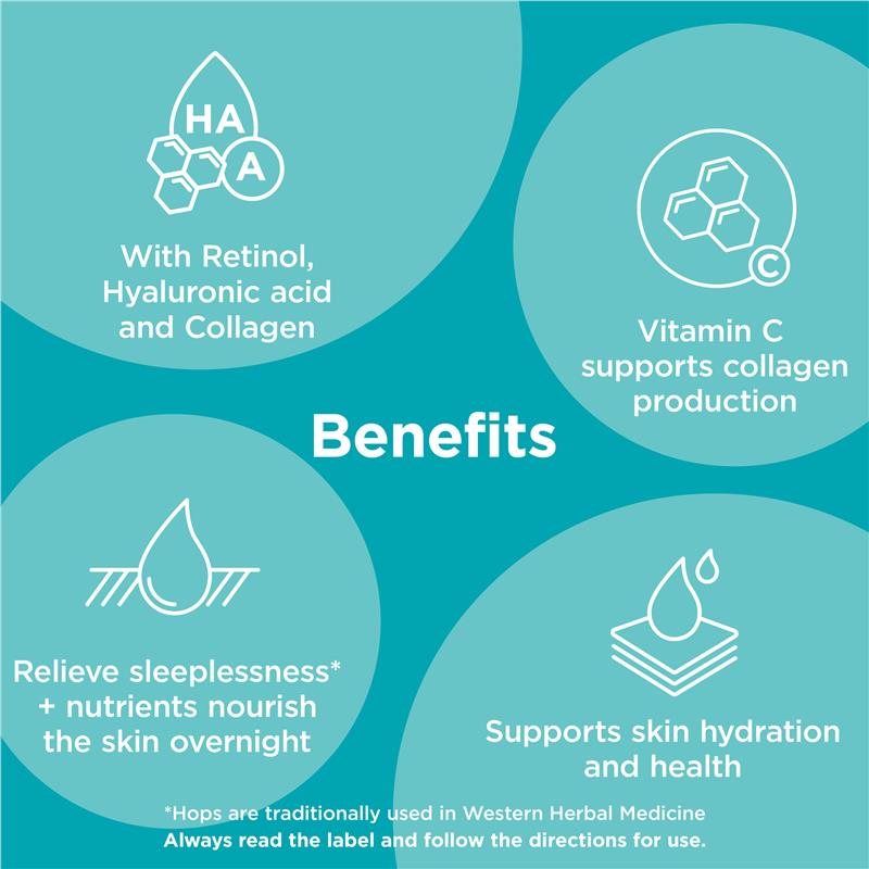 • Với Retinol, Vitamin C,*axit hyaluronic và Collagen.• Theo truyền thống được sử dụng trong Y học thảo dược phương Tây để giảm chứng mất ngủ. Nuôi dưỡng làn da qua đêm.