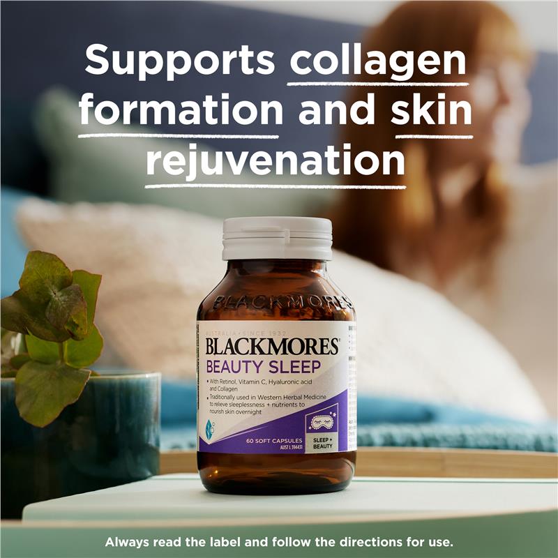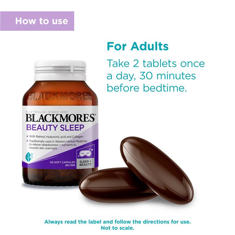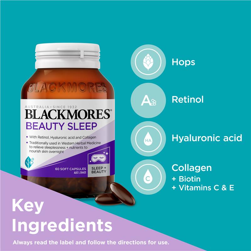 Blackmores Beauty Sleep chứa Hops theo truyền thống được sử dụng trong y học thảo dược phương Tây để hỗ trợ giấc ngủ lành mạnh cùng với Retinol, Hyaluronic Acid, Collagen và Vitamin C để nuôi dưỡng làn da qua đêm. Người lớn uống 2 viên nang một lần một ngày trước khi đi ngủ 30 phút. Sử dụng ngắn hạn tối đa 3 tháng