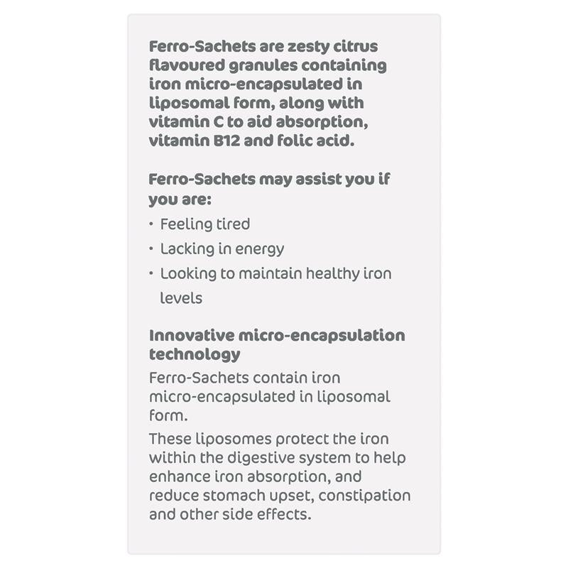Ferro-Sachets® là thực phẩm bổ sung chế độ ăn uống dùng một lần mỗi ngày dưới dạng hạt có hương vị cam quýt tươi mát chứa sắt được vi nang hóa dưới dạng liposome, cùng với vitamin C để hỗ trợ hấp thụ, vitamin B12 và axit folic. Mỗi gói chứa 14mg sắt nguyên tố giúp duy trì mức sắt lành mạnh, năng lượng và sức sống.