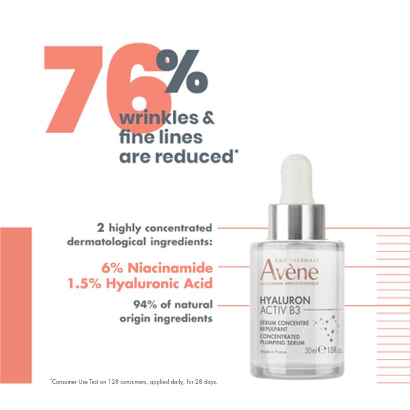 Avène Hyaluron Activ B3 浓缩丰盈精华液可明显减少细纹和皱纹并为肌肤补水*。