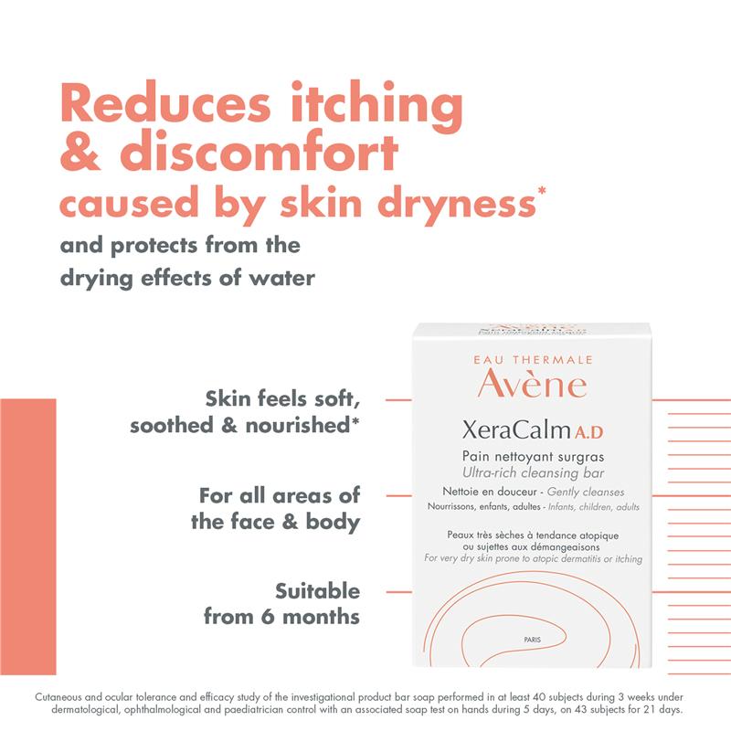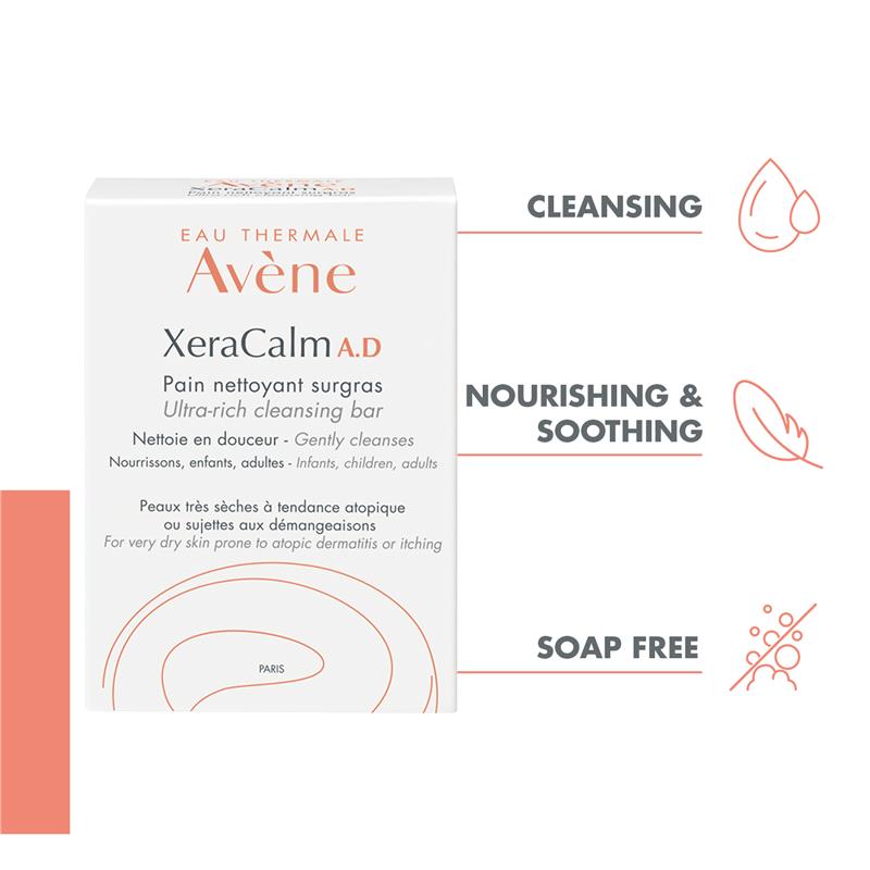 Avène XeraCalm AD 超滋润洁肤皂可舒缓和滋养干燥、易患湿疹的皮肤*,同时保护其免受水的干燥影响。