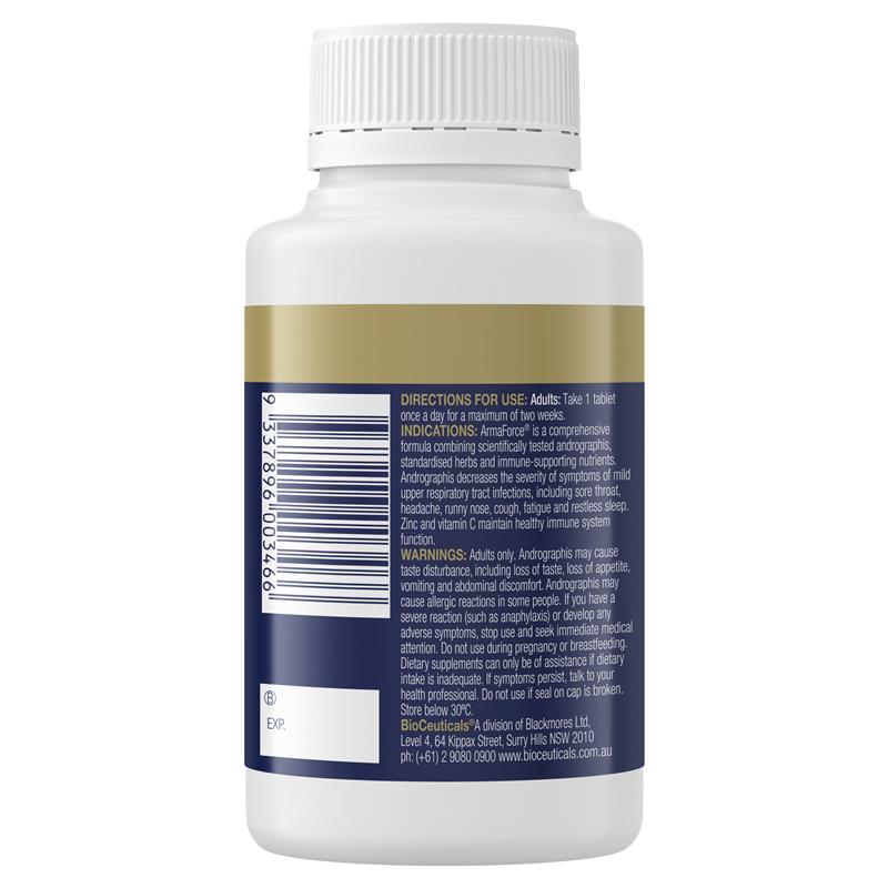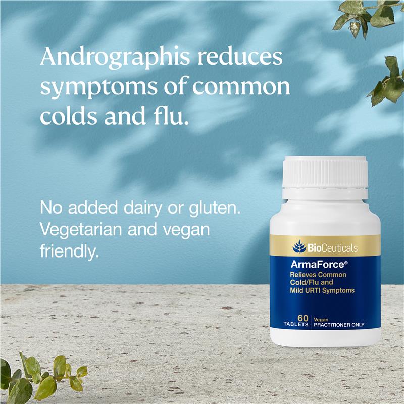 感觉感冒要来了?那就用 ArmaForce® 片剂来预防吧!如果您正饱受咽喉痛、头痛、流鼻涕、咳嗽、疲劳或睡眠不安的困扰,ArmaForce® 都能帮您解决。这款全面的纯素草本补充剂采用特殊配方,结合了穿心莲和增强免疫力的营养成分,可有效缓解普通感冒症状。穿心莲有助于减轻咽喉痛、头痛、流鼻涕、咳嗽和疲劳的严重程度,同时还添加了锌和维生素C,以支持您的免疫系统健康运转。每日服用一片,最多服用两周。适合人群:仅限成人