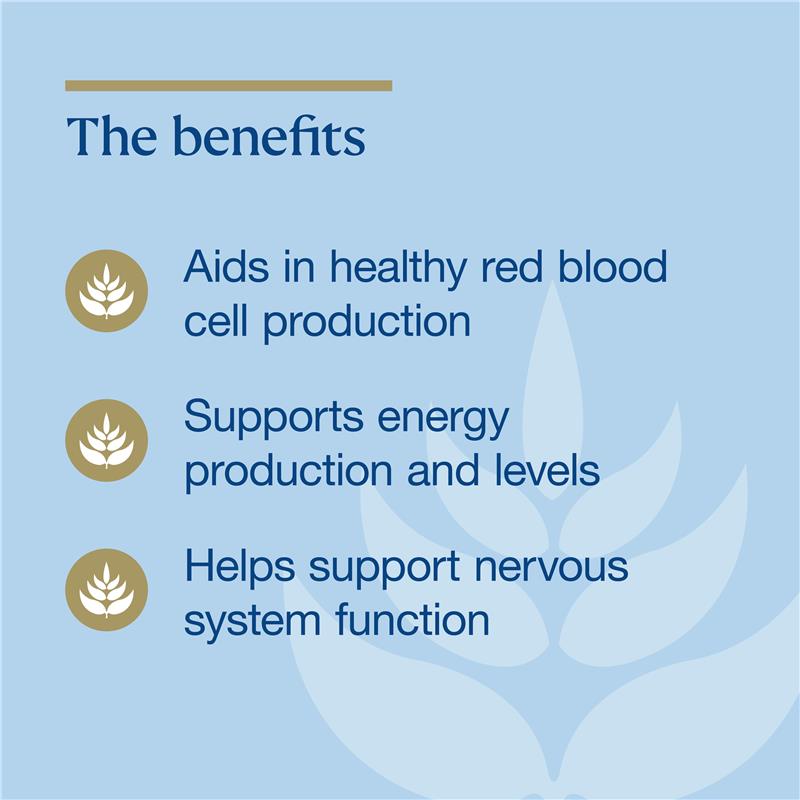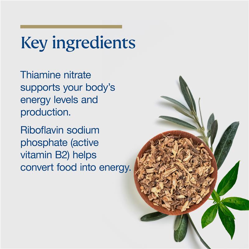 • 维生素 B12 和叶酸有助于健康的红细胞生成,维生素 B6 支持血红蛋白的合成。• 维生素 B1、B2、B3、B6 和 B12 以及 CoQ10 支持能量水平和能量产生。