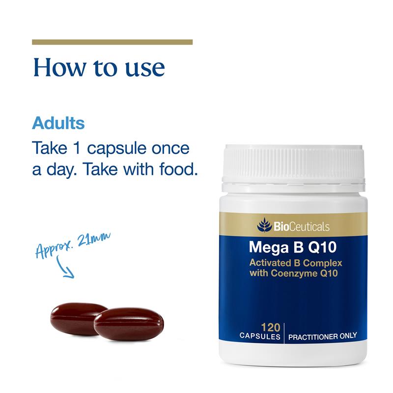 Mega B Q10 含有生物可利用且代谢活性的维生素 B2、B6 和 B9,以及有助于维持能量水平的辅酶 Q10。维生素 E 和辅酶 Q10 是抗氧化剂,可减少体内产生的自由基。维生素 B1、B6 和 B12 有助于维持神经系统功能,维生素 B5 则有助于维持身体健康的应激反应。每日一粒,方便服用,配方全面。适用对象:仅限成人或遵医嘱。