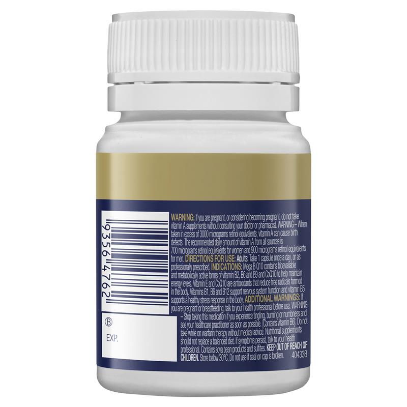 Mega B Q10 含有生物可利用且代谢活性的维生素 B2、B6 和 B9,以及有助于维持能量水平的辅酶 Q10。维生素 E 和辅酶 Q10 是抗氧化剂,可减少体内产生的自由基。维生素 B1、B6 和 B12 有助于维持神经系统功能,维生素 B5 则有助于维持身体健康的应激反应。每日一粒,方便服用,配方全面。适用人群:仅限成人或遵医嘱