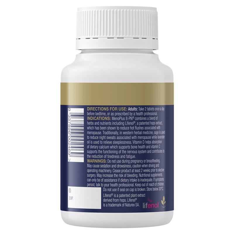 MenoPlus 8-PN® 融合了多种草药和营养成分,其中包括 LifeNol®,一种获得专利的啤酒花提取物,已被证明可以缓解更年期相关的潮热症状。传统西方草药中,鼠尾草用于缓解更年期盗汗,薰衣草油用于缓解失眠。维生素 D 有助于骨骼健康,维生素 C 则支持神经系统功能,有助于缓解疲劳。适用人群:仅限成人或遵医嘱