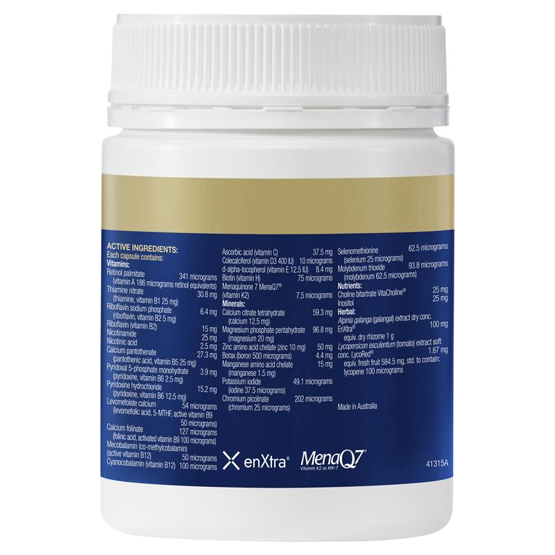 活性成分:每粒胶囊含:维生素:棕榈酸视黄醇酯 341 微克(维生素 A 186 微克视黄醇当量)硝酸硫胺素 30.8 毫克(硫胺素,维生素 B1 25 毫克)核黄素磷酸钠(活性维生素 B2)6.35 毫克(核黄素,维生素 B2 5 毫克)核黄素 15 毫克烟酰胺(维生素 B3)25 毫克烟酸(维生素 B3)2.5 毫克泛酸钙 27.3 毫克(泛酸,维生素 B5 25 毫克)吡哆醛 5-磷酸一水合物 3.9 毫克(吡哆醇,活性维生素 B6 2.5 毫克)盐酸吡哆醇 15.2 毫克(吡哆醇,维生素 B6 12.5 毫克)左甲叶酸钙 54 微克(左甲叶酸,5-MTHF,活性维生素 B9 50 微克) 亚叶酸钙 127 微克(亚叶酸,活性维生素 B9 100 微克) 甲钴胺(复合甲钴胺,活性维生素 B12)50 微克 氰钴胺(维生素 B12)100 微克 抗坏血酸(维生素 C)37.5 毫克 胆钙化醇(维生素 D3 400 IU)10 微克 d-α-生育酚(维生素 E 12.5 IU)8.4 毫克 生物素(维生素 H)75 微克 甲萘醌 7 MenaQ7®(维生素 K2)7.5 微克 矿物质: 柠檬酸钙四水合物(钙 12.5 毫克)59.3 毫克 磷酸镁五水合物(镁 20 毫克)96.8 毫克 锌氨基酸螯合物(锌 10 毫克)50 毫克 硼砂(硼 500 微克)4.42 毫克 锰氨基酸螯合物(锰 1.5 毫克)15 毫克 碘化钾(碘 37.5 微克)49.1 微克 吡啶甲酸铬(铬 25 微克)202 微克 硒蛋氨酸(硒 25 微克)62.5 微克 三氧化钼(钼 62.5 微克)93.8 微克 营养成分: 酒石酸胆碱 VitaCholine® 25 毫克 肌醇 25 毫克 草本: 高良姜(高良姜)提取物干浓缩物 EnXtra® 100 毫克当量干根茎 1 克番茄 (Lycopersicon esculentum) 提取物软浓缩液。LycoRed® 1.67 毫克,相当于新鲜水果 584.5 毫克,标准含量:番茄红素 100 微克