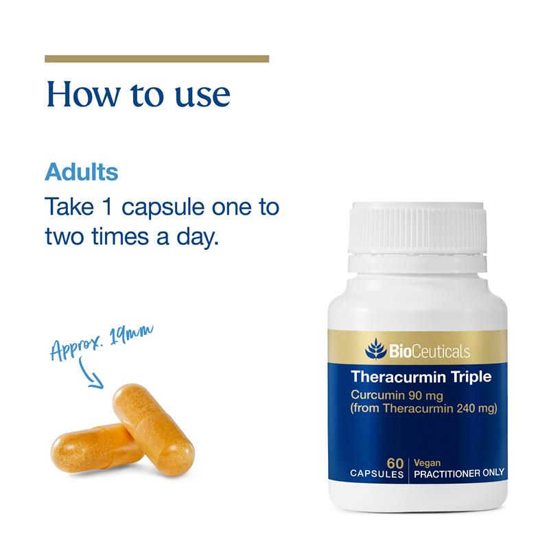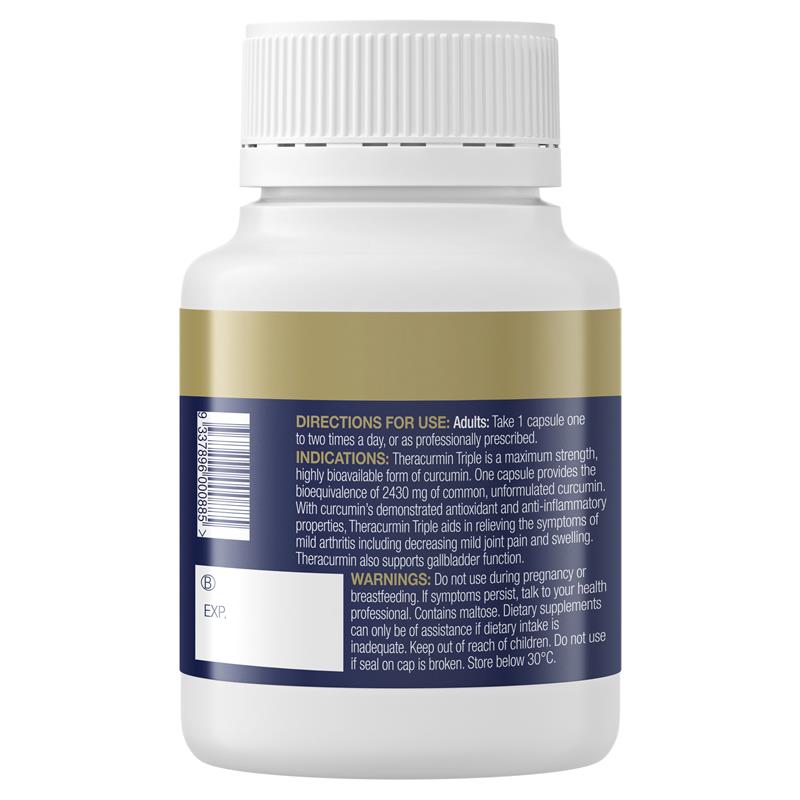 Theracurmin Triple 是一种高剂量、高生物利用度的姜黄素。一粒胶囊含有配方形式的姜黄素 Theracurmin,其生物等效性相当于 2430 毫克普通未配制姜黄素。姜黄素已证实具有抗氧化和抗炎特性。Theracurmin Triple 有助于缓解轻度骨关节炎症状,包括减轻轻微关节疼痛和肿胀。Theracurmin 还能支持胆囊功能。适用人群:仅限成人或遵医嘱