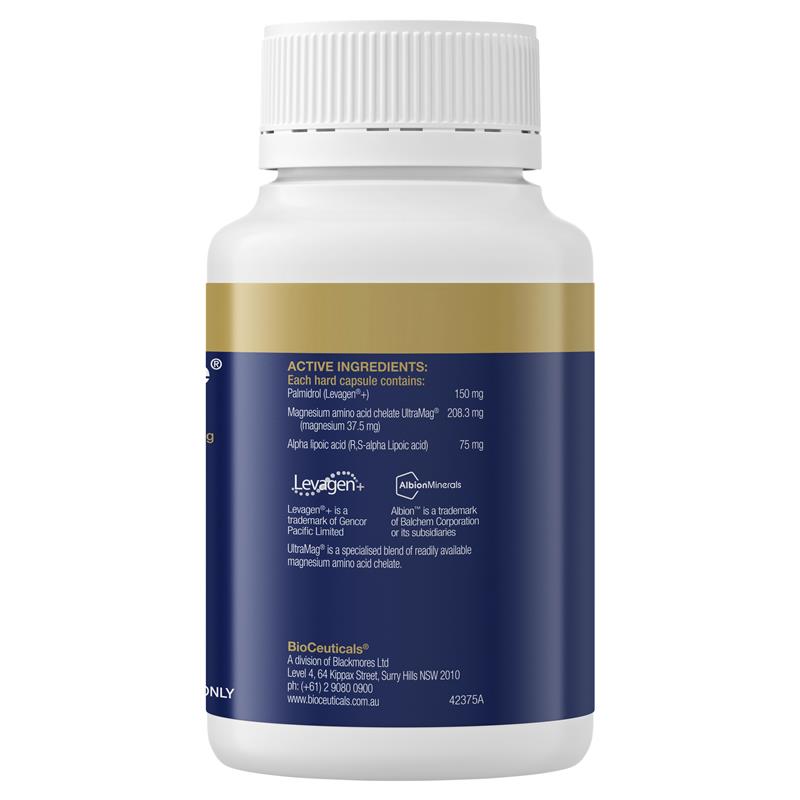BioCeuticals® Ultra Muscleze® + 止痛片含有 UltraMag® 镁、生物可利用的 PEA(Levagen®+)和α-硫辛酸 (ALA)。PEA(棕榈酰乙醇酰胺,也称为棕榈醇)是一种脂肪分子,人体在疼痛和炎症反应中会自然产生。ALA 是一种抗氧化剂,可以减少体内产生的自由基。UltraMag® 是一种特制的易获取氨基酸螯合镁混合物。Levagen®+ 采用 LipiSperse® 技术,与标准 Levagen® PEA 相比,其 PEA 的吸收率可提高高达 70%。适合人群:仅限成人