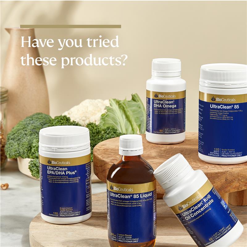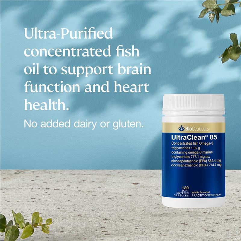 UltraClean® 85 提供强效配方,富含 85% 浓度的超高 Omega-3 脂肪酸,采用经认证的可持续野生鱼类,并采用软胶囊包装。这款鱼油产品符合英国环境与健康部 (GOED) 的新鲜度质量标准。