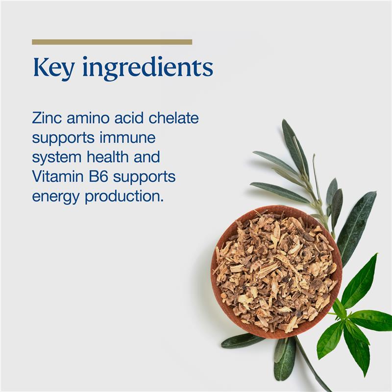 • 锌支持免疫系统功能和伤口愈合。• 维生素 A 和锌有助于健康的眼睛功能和皮肤健康。