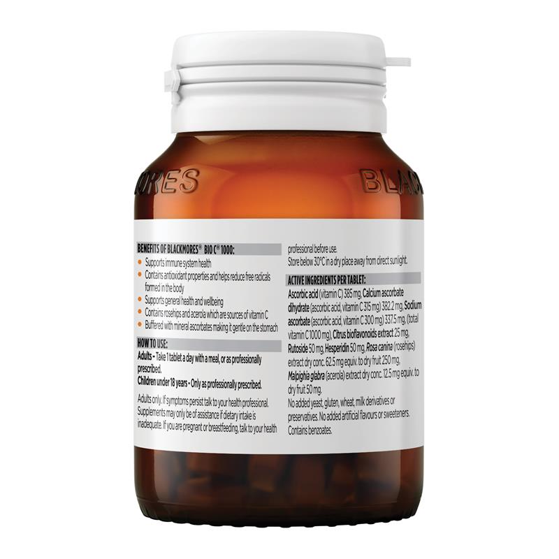 使用 Blackmores Bio C® 1000 片剂,缓解恼人的感冒症状。这款每日一片的配方,富含维生素 C,可减轻普通感冒的严重程度并缩短其持续时间。它以矿物质抗坏血酸盐为缓冲剂,为您提供温和不伤胃的维生素 C。它还含有维生素 C 和生物类黄酮,它们协同作用,增强维生素 C 的活性。使用方便的每日一片 Blackmores Bio C® 1000 片剂,支持您的免疫系统健康。适用人群:仅限成人。18岁以下儿童 - 需遵医嘱。