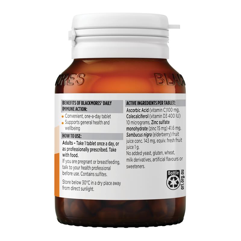 Blackmores Daily Immune Action 是一种方便的每日一片药片,可全年支持免疫健康。特别配制了每日维生素 C、维生素 D、锌和接骨木果混合物,您每天只需服用一片即可照顾您的免疫健康,因此每天都会感觉良好。