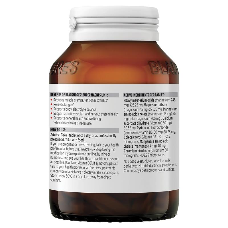 需要缓解肌肉痉挛、紧张和僵硬吗?如果您的饮食摄入不足,不妨试试 Blackmores 超级镁片。这款高剂量片剂含有两种形式的镁,有助于提升肌肉耐力和能量水平。如果您的饮食中镁含量较低,超级镁片可以支持您的心血管和神经系统健康。它还能促进碳水化合物代谢,并维持体内电解质平衡。只需每日一剂,即可轻松缓解您的肌肉酸痛。适用对象:仅限成人,或遵医嘱。