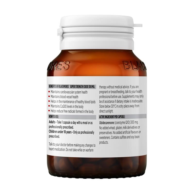 使用 Blackmores 超强效辅酶 Q10 300 毫克胶囊,呵护您的心脏健康。本配方富含一天所需的浓缩辅酶 Q10,这是一种天然存在于心肌中的抗氧化酶。它有助于维持心血管系统健康、血管健康,并有助于维持健康的血脂。辅酶 Q10 水平会随着年龄增长而自然下降,本胶囊有助于维持和支持体内辅酶 Q10 水平。成人:每日服用一粒胶囊,以保持心血管健康。适用人群:仅限成人。18岁以下儿童 - 需遵医嘱。