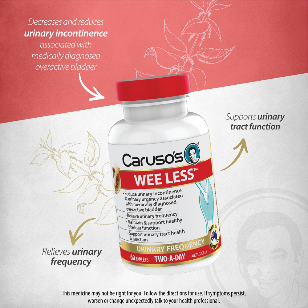 Caruso 的 WEE LESS® 是一种独特的草药配方,旨在减少与医学诊断的膀胱过度活动症相关的尿失禁和尿急。