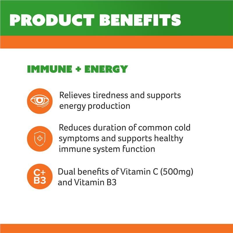 益处:益处:Cenovis® 咀嚼免疫+能量片含有维生素 C 500 毫克+维生素 B3,口感极佳,橙味咀嚼片,99% 无糖。• 支持健康的免疫系统功能并缓解疲劳