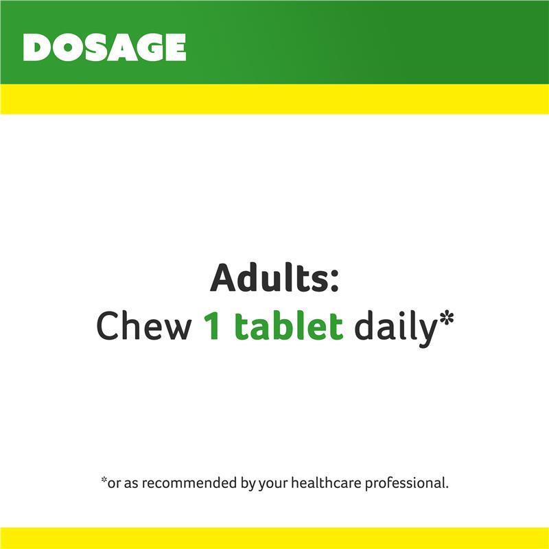 成人每日咀嚼1片,或遵医嘱。吞咽前请咀嚼。