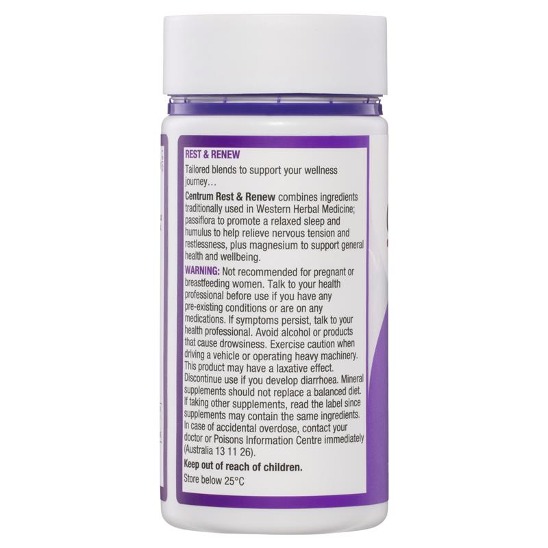 感觉放松并恢复活力。 Centrum 休息与焕新中心 结合了西番莲(传统上在西方草药中用于促进放松睡眠)和葎草(传统上在西方草药中用于帮助缓解神经紧张和烦躁)以及镁,以支持整体健康和福祉。