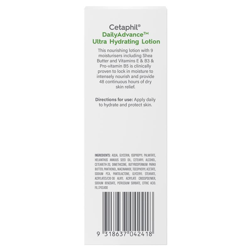 Cetaphil DailyAdvance 超保湿乳液经临床验证对皮肤温和,可提供 48 小时持久保湿。这种滋养、低过敏性和无香味的配方可立即舒缓肌肤,适合干性至极干性和敏感性皮肤的日常使用。