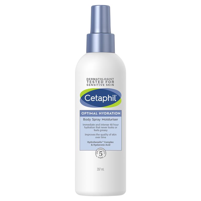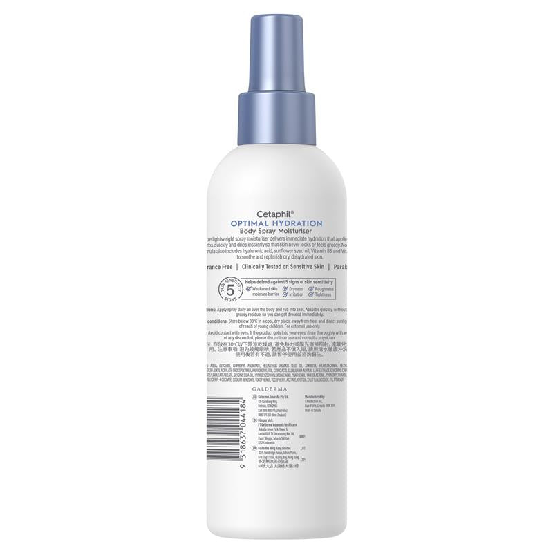 Cetaphil Optimal Hydration 身体喷雾保湿霜可提供强效持久的 48 小时保湿。含有创新的 HydroSensitiv™ 复合物、透明质酸、葵花籽油、维生素原 B5 和维生素 E,其滋养配方可温和舒缓干燥肌肤并补充其保护性水分屏障。这款轻盈无香的喷雾保湿霜吸收迅速,瞬间变干,让您的肌肤保持水润,不会看起来或感觉油腻。产品功效:48小时保湿