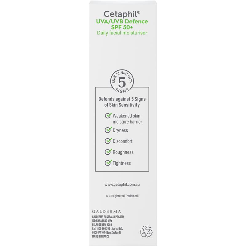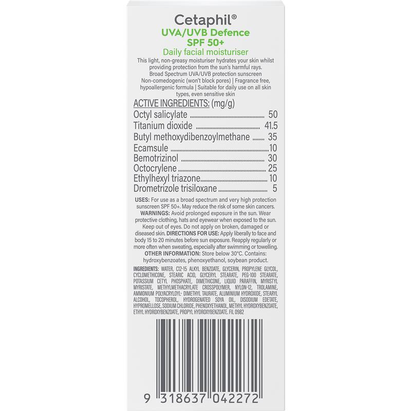 Cetaphil UVA/UVB Defence with SPF 50+ 日常面部保湿霜含有保湿甘油和必需维生素 E,可有效保湿并帮助提高皮肤弹性,同时保护皮肤免受有害 UVA 和 UVB 射线的伤害。其配方不含香料、低过敏性和非粉刺性,因此不会堵塞毛孔,并且足够温和,适合所有皮肤类型的日常使用。适合:脸部,所有肤质