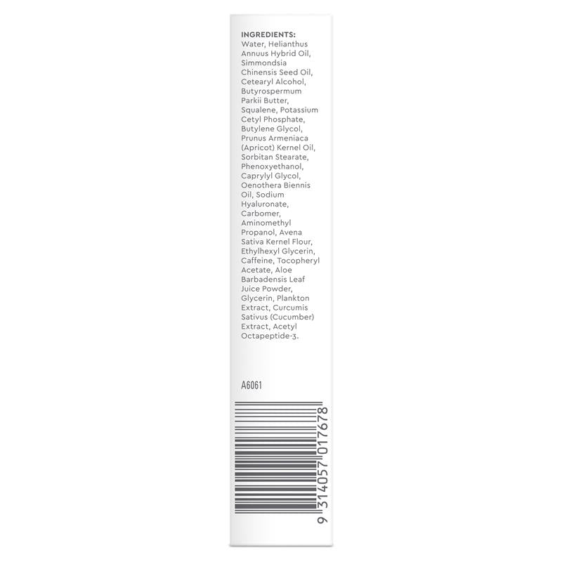 水、向日葵杂交油、荷荷巴油、鲸蜡硬脂醇、牛油果脂、角鲨烯、十六烷基磷酸钾、丁二醇、杏仁油、山梨醇硬脂酸酯、苯氧乙醇、辛乙二醇、月见草油、透明质酸钠、卡波姆、氨甲基丙醇、燕麦仁粉、乙基己基甘油、咖啡因、生育酚乙酸酯、芦荟叶汁粉、甘油、浮游生物提取物、姜黄提取物、乙酰基八肽-3