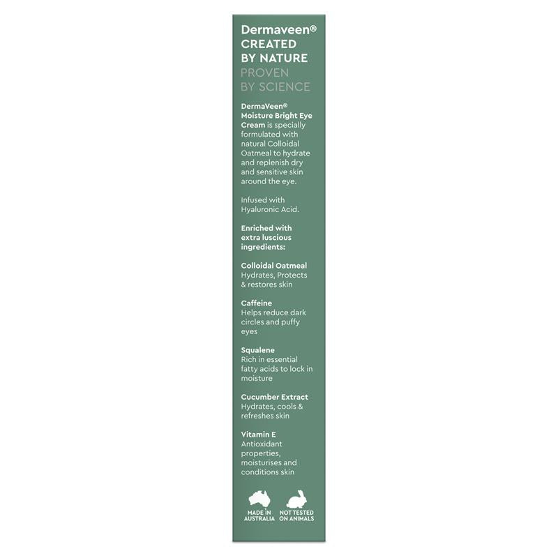 DermaVeen 保湿亮泽眼霜采用天然胶体燕麦特别配制,可为眼周干燥和敏感的皮肤补水和滋润。富含透明质酸和角鲨烯。低过敏性。