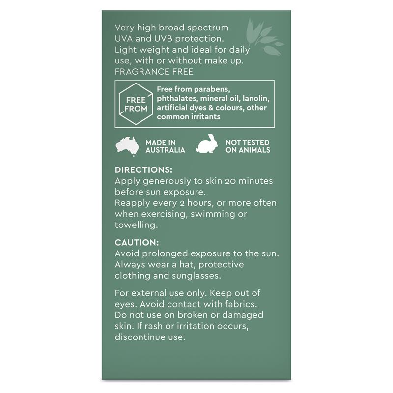 该配方提供非常高的广谱 UVA 和 UVB 防护,有助于预防太阳黑子和皮肤过早老化。它采用天然胶体燕麦和芦荟制成,具有舒缓和保湿作用。质地轻盈,非常适合日常使用,无论是否化妆。保湿、隐形效果。