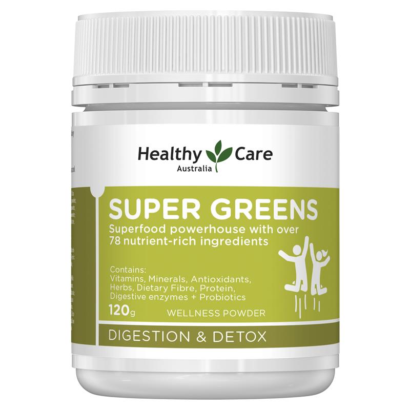 Healthy Care Super Greens 是一款营养丰富的超级食品配方,有助于增强活力、促进身体排毒和消化健康。它含有天然全食物,例如:螺旋藻、小球藻、小麦草、大麦、越橘、西印度樱桃、可可豆和绿茶。