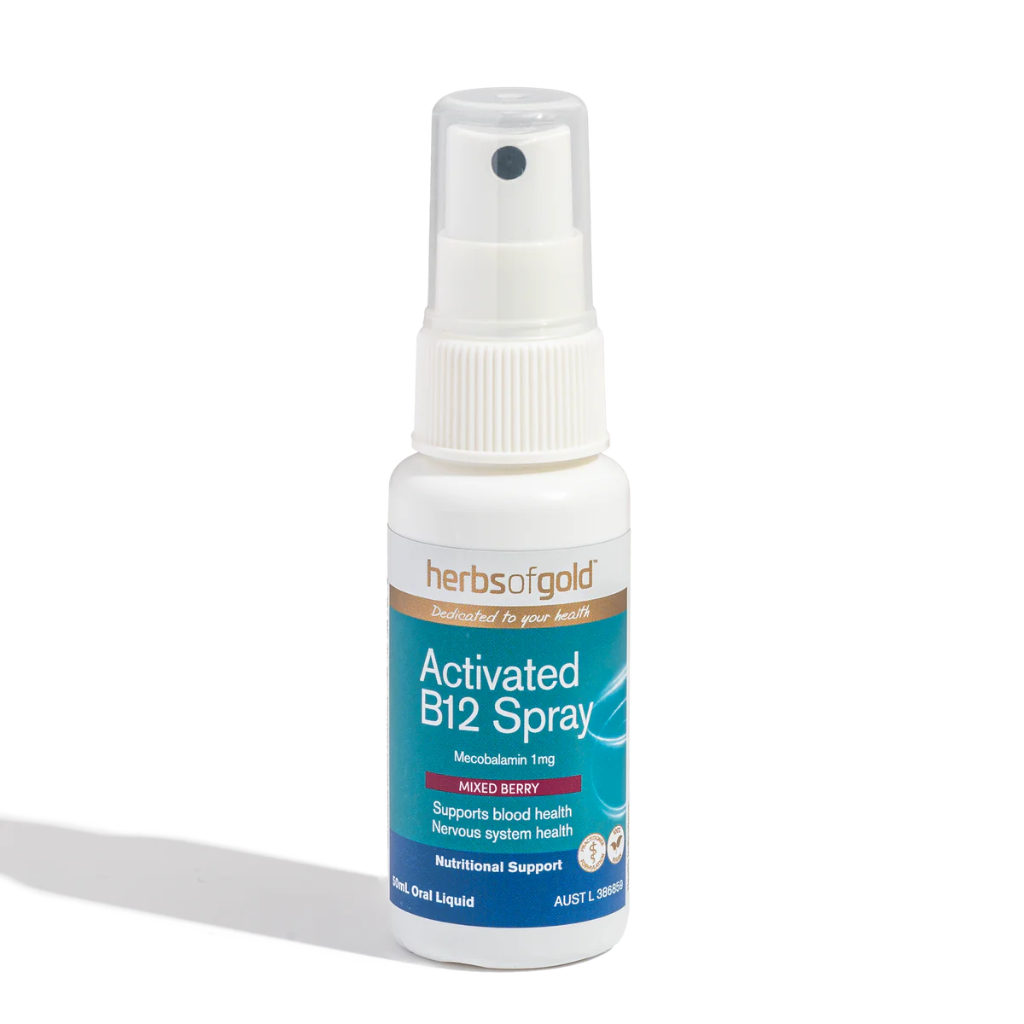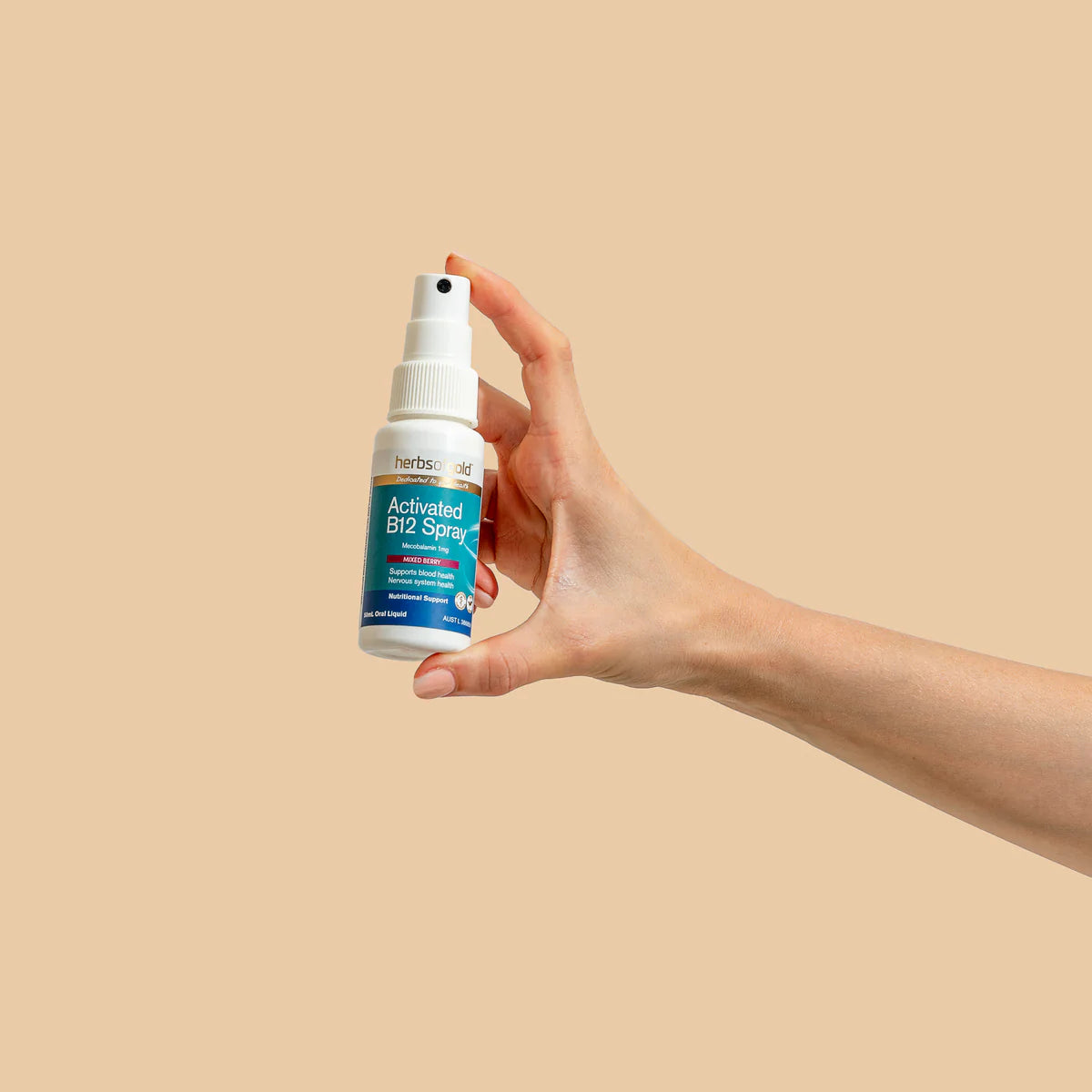 Herbs of Gold 活性 B12 喷雾提供高强度甲钴胺(维生素 B12),是一种方便、美味的混合浆果味喷雾,可在舌下迅速吸收。