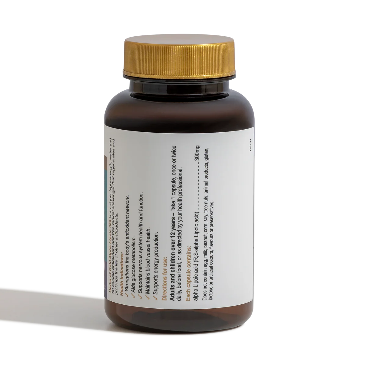 Herbs of Gold Alpha Lipoic 300 含有高强度的α-硫辛酸,这是一种可减少体内形成的自由基的抗氧化剂。