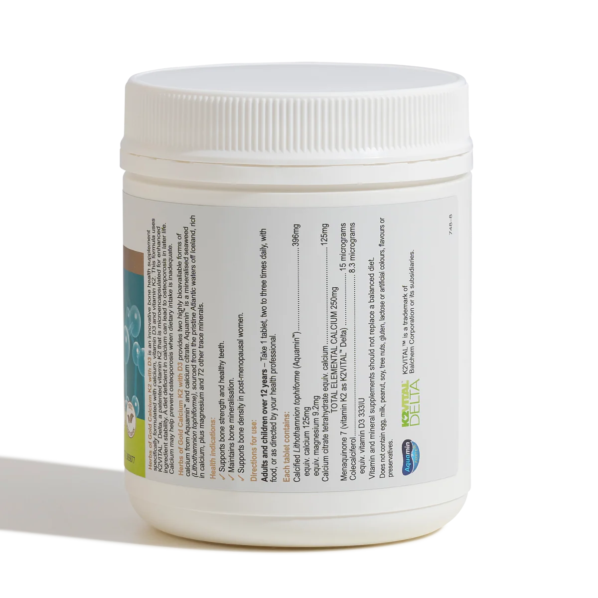 - 含 D3 的钙 K2 含有两种易于吸收的钙 - Aquamin™ 和柠檬酸钙。