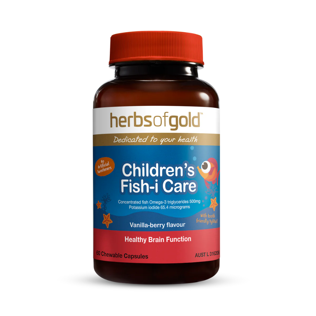 Herbs of Gold 儿童 Fish-i Care 含有浓缩鱼油,提供二十碳五烯酸 (EPA) 和二十二碳六烯酸 (DHA) ω-3 脂肪酸以及碘。