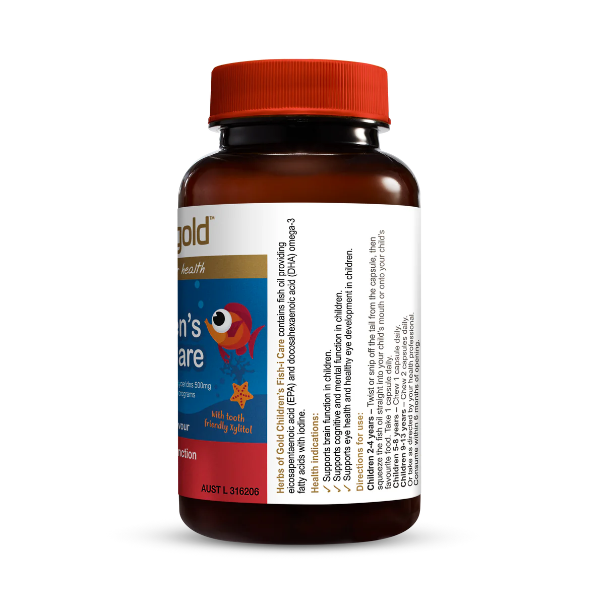 - 儿童 Fish-i Care 是一种美味的香草浆果咀嚼胶囊,其中含有对牙齿有益的木糖醇天然甜味剂。