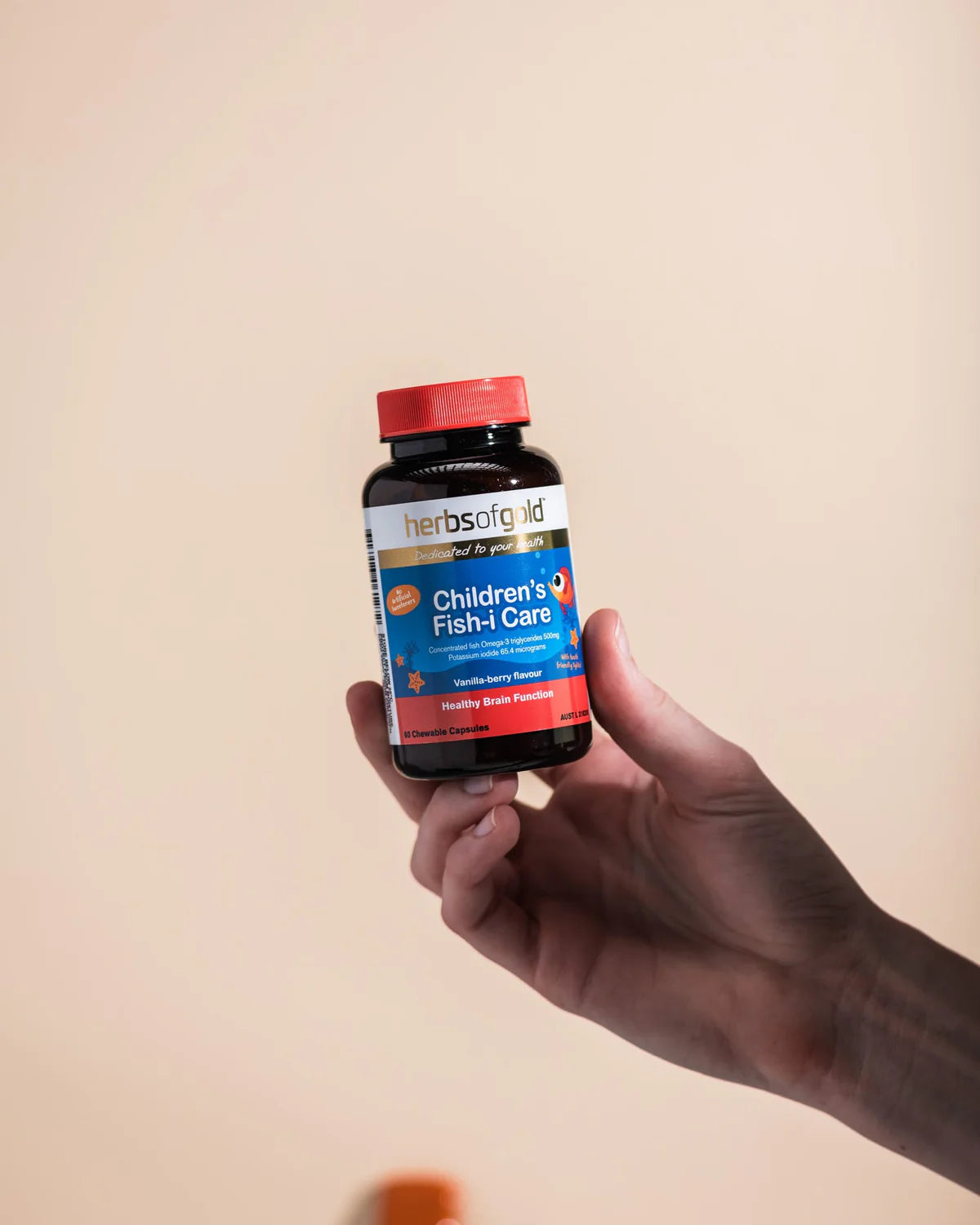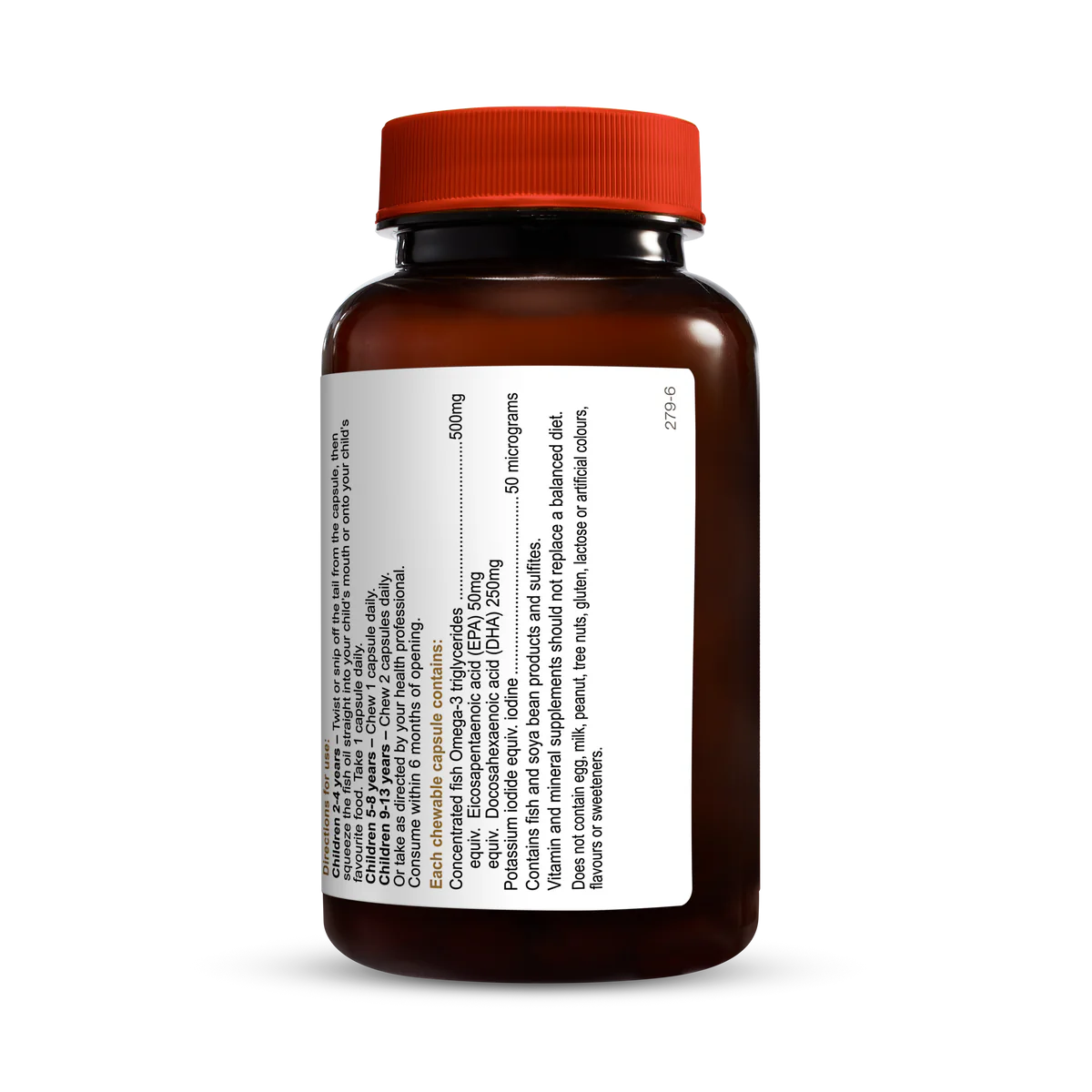 - 儿童 Fish-i Care 含有 50 毫克 EPA 和 250 毫克 DHA 以及碘,有助于预防儿童缺乏 omega-3 必需脂肪酸和碘。
