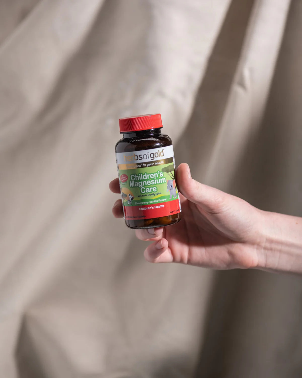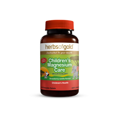 Herbs of Gold 儿童镁护理是一种美味的草莓香草味咀嚼片,含有镁,可支持儿童的神经系统健康。
