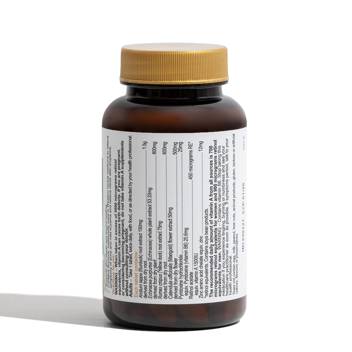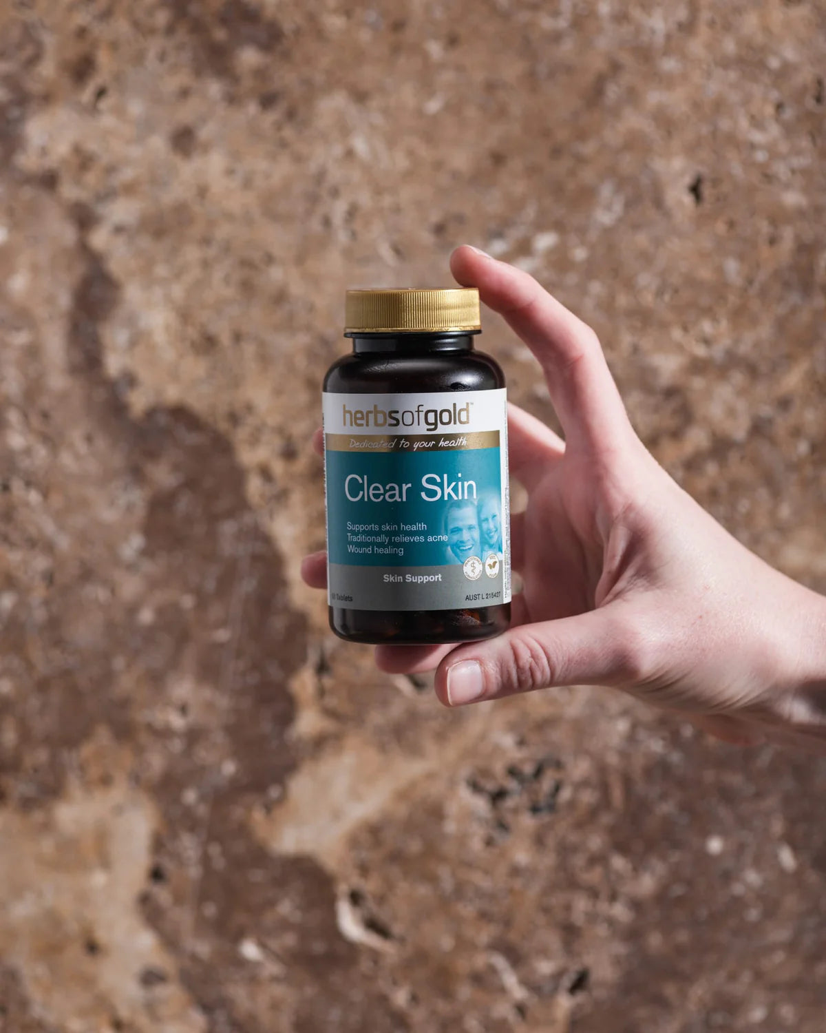 Herbs of Gold Clear Skin 是多种营养成分加上牛蒡和黄酸模的组合,这两种草药在西方草药中传统上用于维持皮肤健康。